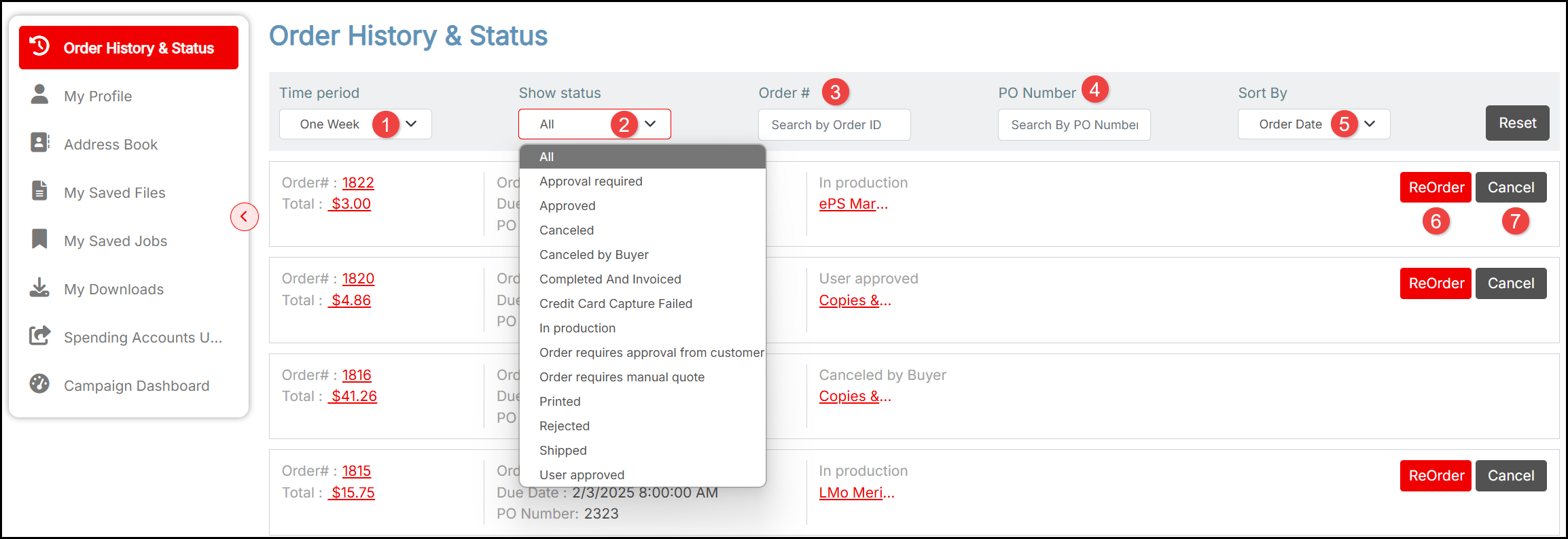 - Filter by Show status to view, for example, whether an order is In production, awaiting Approval or Quote, Rejected for a particular reason, Cancelled or Shipped.
