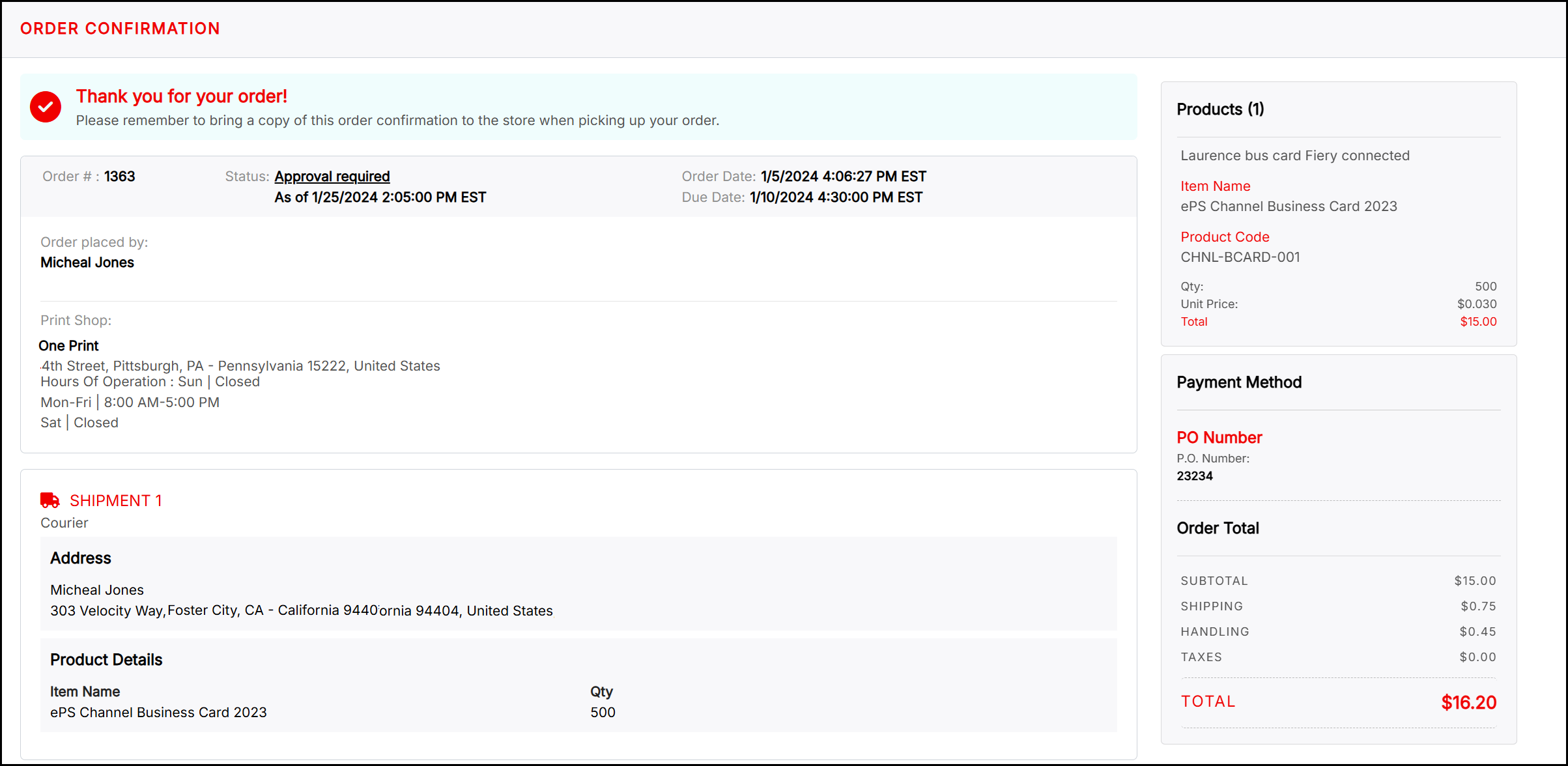 When an order you place requires approval, the Order Confirmation page (the last step in the checkout process) shows the Status of the order as Approval required.
