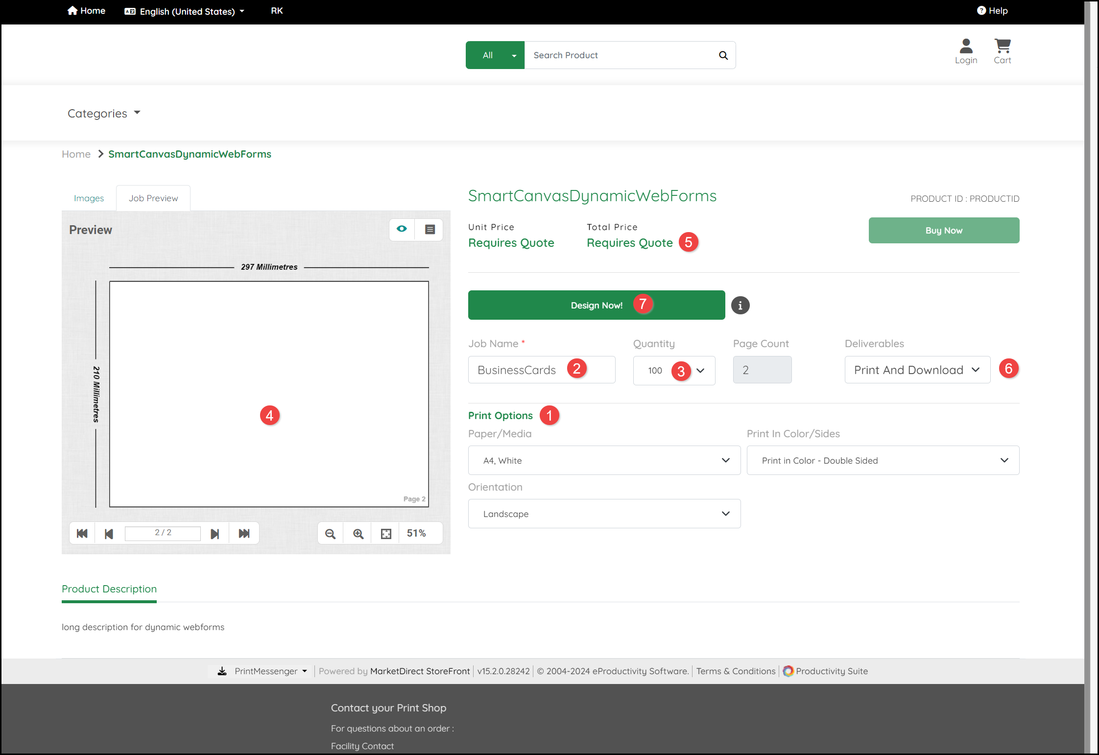 - Access Print Options for the product. These vary depending on the product selected but could include options such as Paper/Media, Color Options, Materials and Orientation, Lamination and Sizes.