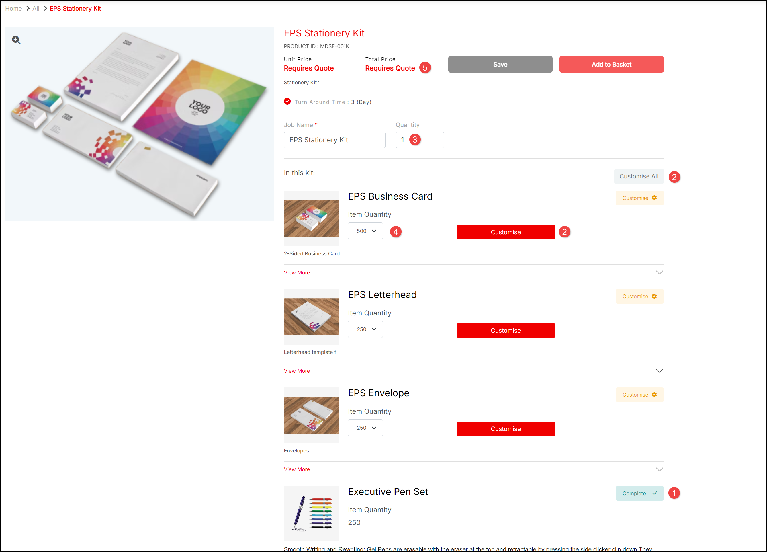 - Customise options for individual products or specific design and branding options which you can apply as Customise All.